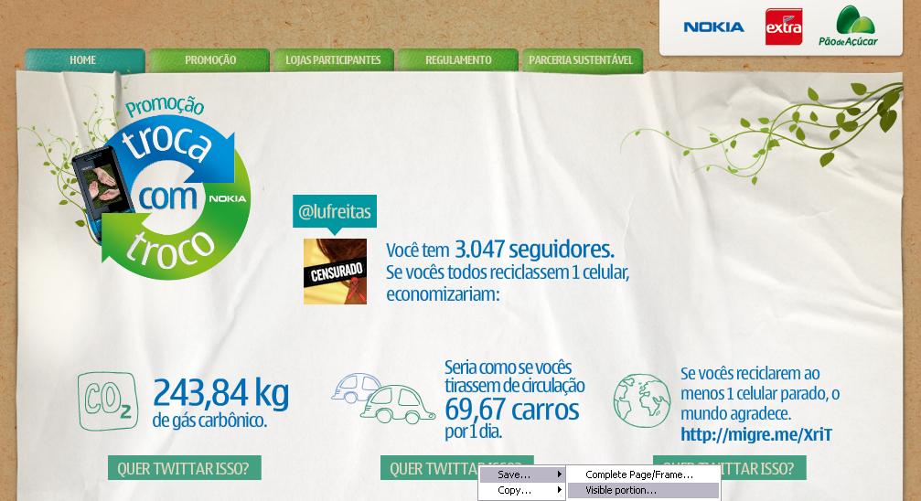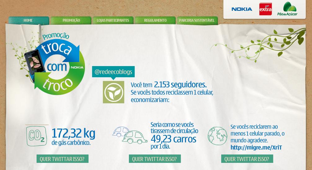 Estimativas da empresa apontam que se todos os cerca de 4,8 bilhões de usuários no mundo devolvessem pelo menos um aparelho, seria possível economizar 380 mil toneladas de matéria-prima e reduzir a emissão de gases – o mesmo efeito que retirar quatro milhões de carros das ruas. Por isso, além dos postos de entrega, é possível calcular no site quanto você e seus seguidores no Twitter conseguiriam retirar do meio ambiente se reciclarem um dos celulares que devem ter aí em casa. O meu caso em particular está aí em cima :). Aqui embaixo o efeito da @redeecoblogs.