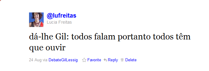 A boa notícia que veio no mesmo dia foi a entrada do Marco Civil da Internet na pauta do Congresso. Sim, aquele processo do qual participamos chega, finalmente, ao Congresso e pode garantir nossos direitos online. Sobre o debate: pena o Ronaldo Lemos e o Lessig ficarem tão calados. São vozes importantes, sempre. É sempre um prazer ver o Gil em ação. Coisa emocionante como ele produz afetos e emociona – mesmo falando de coisas políticas.