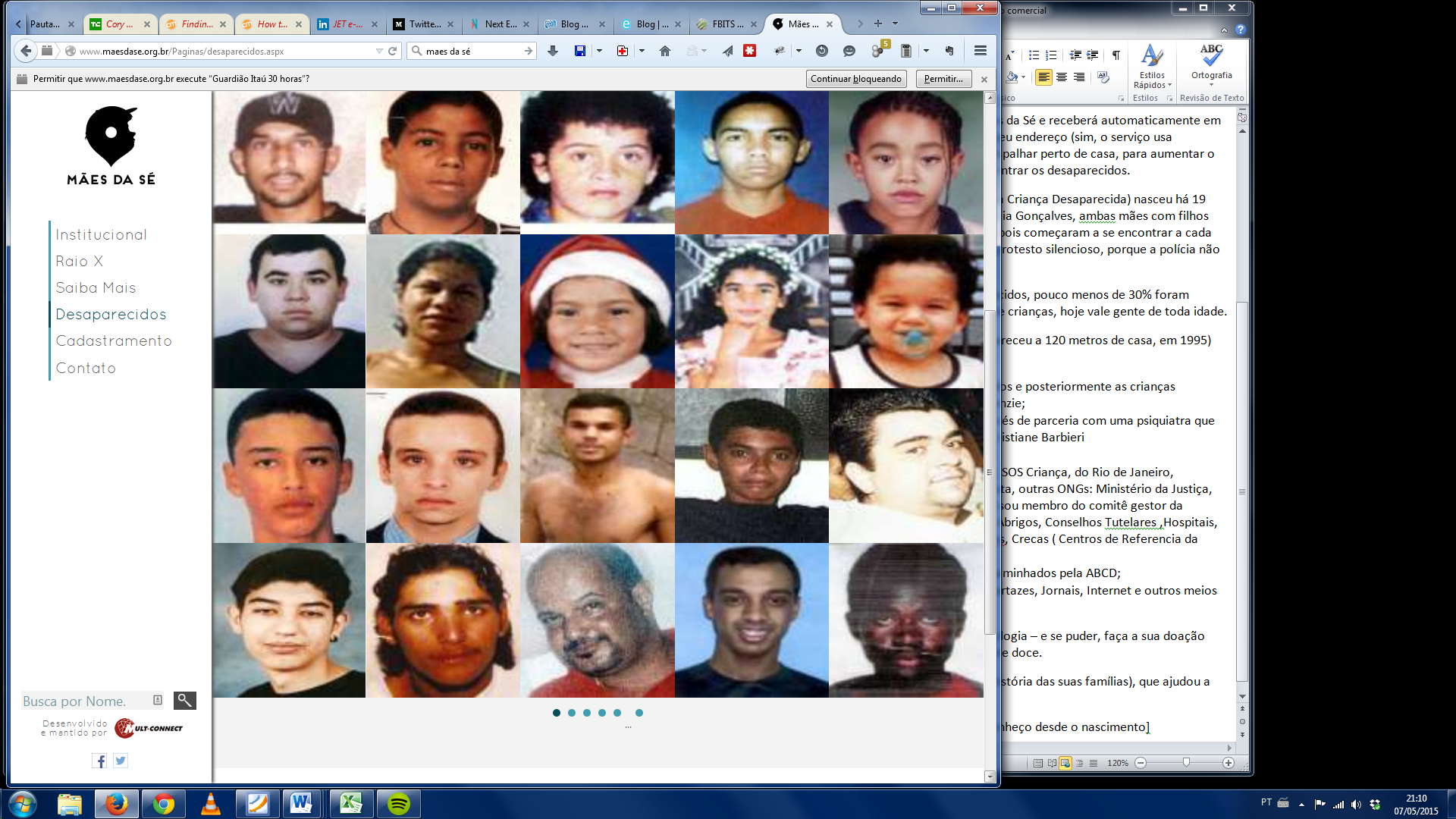 • Parcerias com a Delegacia de Pessoas Desaparecidas, DHPP, SOS Criança, do Rio de Janeiro, Fundação Criança de São Bernardo do Campo, no ABC Paulista, outras ONGs: Ministério da Justiça, Através da Secretaria Especial de Direitos Humanos, da qual sou membro do comitê gestor da Redesap (Rede de – Localização de Crianças Desaparecidas, Abrigos, Conselhos Tutelares ,Hospitais, Varas da Infância e Juventude, Ministério Público, Creas, Cras, Crecas ( Centros de Referencia da Criança e Adolescentes);