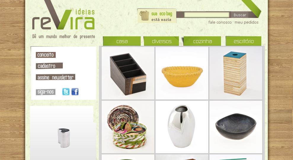 Esta semana é a vez de apresentar a vocês a Revira Ideias, projeto do Alexandre Oelsner e da sua sócia Sheina. Tudo começou no ano passado, quando eles resolveram morar juntos. “Queríamos uma decoração ecologicamente correta em nosso apartamento, mas tivemos dificuldades de encontrar produtos que se encaixassem dentro deste conceito. Começamos então a fazer uma pesquisa pelo país todo e vimos que existiam, sim, muitos produtos eco-sustentáveis por aí, só faltava alguém reuni-los dentro do mesmo local”, conta. Resolvido o ninho, a dupla dinâmica colocou a loja no ar em agosto de 2010 – o e-commerce está cheirando a byte novo, portanto. O investimento, não revelado pelo empreendedor, foi nas mercadorias (eles tem estoque próprio) e no sistema de e-commerce.