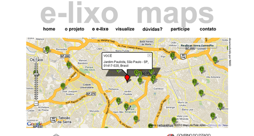 Se você não doa a uma instituição – que pode reciclar ou reaproveitar o seu equipamento – a solução está, a partir de agora, ao alcance de um clique. A Secretaria do Meio Ambiente do Estado de São Paulo e o Instituto Sergio Motta, lançaram o “e-lixo maps“. A partir do Google Maps, você digita o seu CEP e o tipo de lixo eletrônico que precisa descartar e encontra os lugares mais próximos para a entrega. Pena que só funciona para São Paulo. O Banco de Dados do projeto contem um conjunto inicial de postos de coleta e contará com o cadastramento contínuo de novos estabelecimentos. Quem faz coleta, mas não está no mapa, pode se cadastrar.